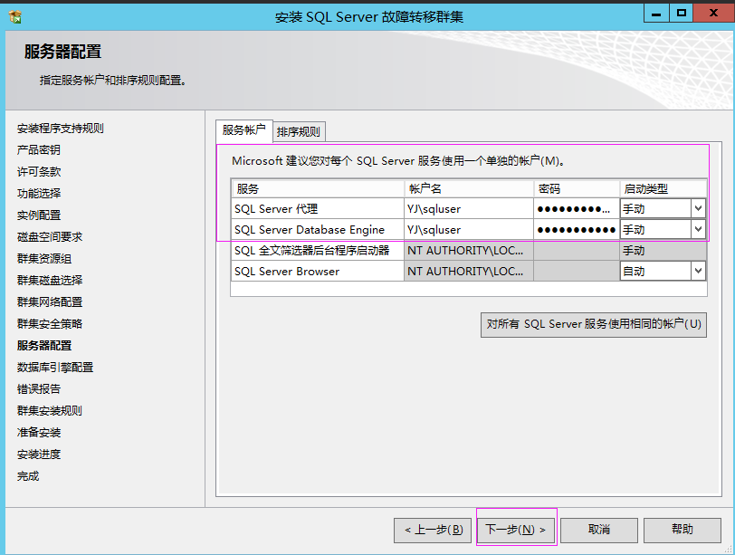 在ad01 上创建一个域用户sqluser(密码永不过期),安装SQL群集时会用到。