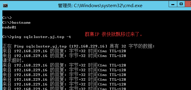 再打开node01,关闭node02的同时,在node01上面ping sqlcluster.yj.top