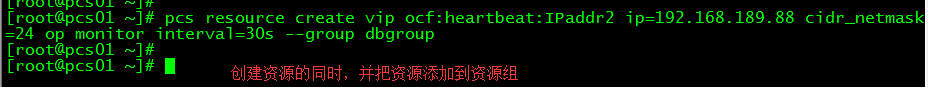 3.8、创建VIP资源 (在任何一个节点操作即可) pcs resource create vip ocf:heartbeat:IPaddr2 ip=192.168.189.88 cidr_netmask=24 op monitor interval=30s --group dbgroup