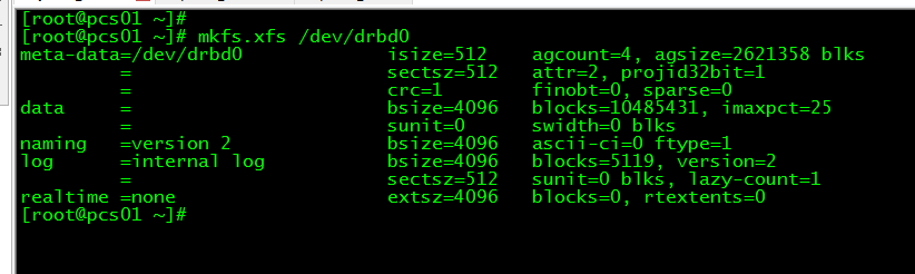 4.7、格式化DRBD,在主节点上操作。pcs01 mkfs.xfs /dev/drbd0