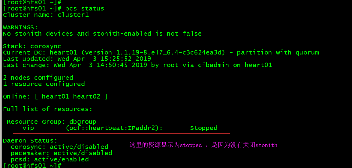 创建主从资源: pcs -f drbd_cfg resource master drbdclone mynfs master-max=1 master-node-max=1 clone-max=2 clone-node-max=1 notify=true --group dbgroup pcs cluster cib-push drbd_cfg