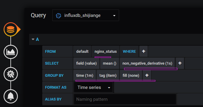 连接总数、握手总数、请求总数 监控nginx 的python脚本: vim /data/influxdb/nginx_status.py #在 119.3.92.176 上,编写python 脚本。 from influxdb import InfluxDBClient import urllib2 response=urllib2.urlopen('http://119.3.92.176/status') result = response.read() list_result = result.split('\n') nginx_result = list_result[2].split() client = InfluxDBClient('127.0.0.1', 8086, 'xc', 'w…123', 'shijiange') data_list = [{'measurement': 'nginx_status', 'tags': {'item': 'nginx.accepts'}, 'fields': {'value': int(nginx_result[0]) }}] client.write_points(data_list) data_list = [{'measurement': 'nginx_status', 'tags': {'item': 'nginx.handled'}, 'fields': {'value': int(nginx_result[1]) }}] client.write_points(data_list) data_list = [{'measurement': 'nginx_status', 'tags': {'item': 'nginx.requests'}, 'fields': {'value': int(nginx_result[2]) }}] client.write_points(data_list)