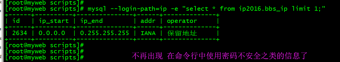 也可以把把--host 写上 mysql_config_editor set --login-path=ip --host=localhost --user=ip --password --login-path 登录路径名称,可以任意,一个用户,对应一个login-path
