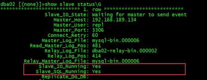 登录原来的master ,dba02,192.168.189.133 CHANGE MASTER TO MASTER_HOST='192.168.189.134', MASTER_PORT=3306, MASTER_AUTO_POSITION=1, MASTER_USER='repl', MASTER_PASSWORD='repl520'; start slave;