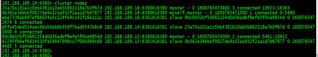 早期版本的 redis-trib.rb 在这一步的时候就会出现,创建出来的主从复制集不标准。 登录集群,查看状态。