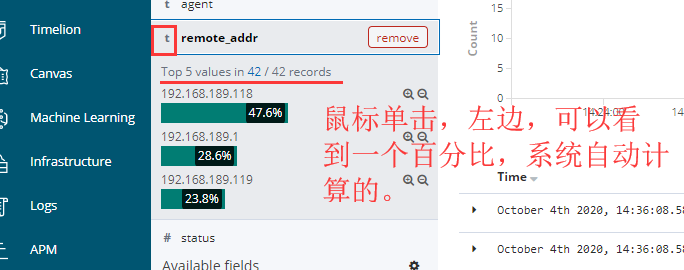 清除ES里面的索引数据,以及删除kibana里面的数据。重启filebeat 再清空nginx 的日志,并重新生成一些nginx 日志数据, >/var/log/nginx/access.log ab -n 120 -c 120 http://192.168.189.118/abcx200s404.html 也可以在其他虚拟机上,进行压力测试,或者访问189.118的nginx ,产生多一些的日志。 这时,我们再查看,ES里面的数据,会发现,日志格式分生了改变。