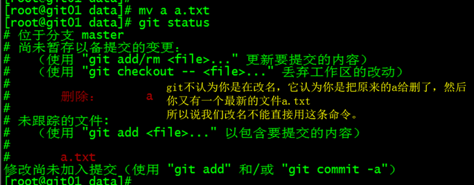 小结:如何真正意义上通过版本控制系统 管理文件 1.工作目录必须有个代码文件 2.通过git add file 添加到暂存区 3.通过 git commit -m "你自己输入的信息" 添加到本地仓库 +++++++++++++++++++++++++ 修改文件名称两种方法: cd /root/data mv a a.txt && git status