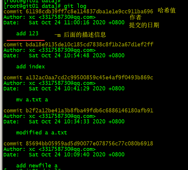 从暂存区,提交到本地仓库: git commit -m "add newfile a " -m:信息,提交的显示的一些描述信息,也可以不用加这个参数,就没有提示。