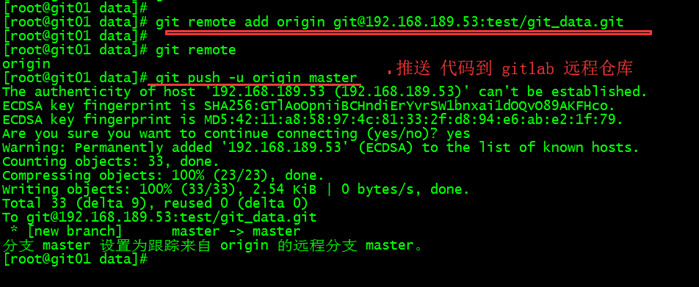 添加一个我们自己创建的Gitlab 仓库: git remote add origin git@192.168.189.53:test/git_data.git 推送代码到Gitlab git push -u origin master