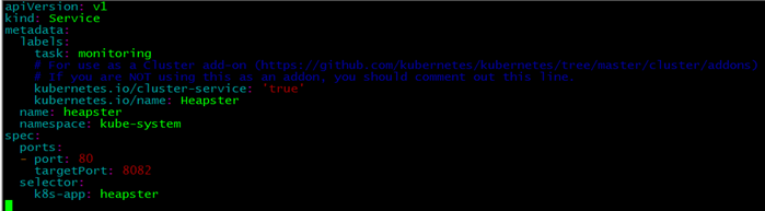 vim svc.yaml apiVersion: v1 kind: Service metadata: labels: task: monitoring kubernetes.io/cluster-service: 'true' kubernetes.io/name: Heapster name: heapster namespace: kube-system spec: ports: - port: 80 targetPort: 8082 selector: k8s-app: heapster