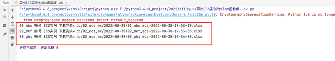 python 版 3.6.8 需要安装 阿里云插件 xlwings 模块 需要安装的 aliyun-python-sdk aliyun-python-sdk-core aliyun-python-sdk-ecs ######### 电脑上需要装有 office 软件,阿里云账号的 ACCESS key写成一个文本文件############## from aliyunsdkcore.client import AcsClient from aliyunsdkcore.acs_exception.exceptions import ClientException from aliyunsdkcore.acs_exception.exceptions import ServerException ## 阿里云 ECS 请求,实例描述,,调用:DescribeInstances,查询一台或多台ECS实例的详细信息 from aliyunsdkecs.request.v20140526.DescribeInstancesRequest import DescribeInstancesRequest import json,time,os import xlwings as xw lst1 = __file__.split('/') base_path = '/'.join(lst1[:-1]) sk = '/'.join([base_path,'ask2']) ## 导出 多个 阿里云账号下面的 多个ECS,并保存为 xlsx文件,函数版。 ## 下载 ECS 实例,保存为 xlsx 文件 def download_ecs(): with open(sk) as f: ## 读取 存储ACCESSKey文件 while True: lst2 = [] line = f.readline() if len(line) == 0: break lst = line.strip().split('|') accessKeyId, accessSecret, region,account = lst[0],lst[1],lst[2],lst[3] client = AcsClient(accessKeyId, accessSecret, region) # AK,SK,Region request = DescribeInstancesRequest() # 查询ECS实例信息 request.set_PageSize(100) try: response = client.do_action_with_exception(request) reslut_s = response.decode('utf-8')##转成str dict1 = json.loads(reslut_s) ##转成 字典 lst1 = dict1["Instances"]["Instance"] if len(lst1) == 0: print(lst[3]+'账号下面,没有ECS实例。') continue for i in range(len(lst1)): # for k, v in lst1[i].items(): # print(k,v) #print(lst1)## 返回的是一个列表套字典,一个实例,是列表的一个元素,也就是一个,字典。 dict2 = lst1[i] lst2.append(dict2['InstanceName']) lst2.append(dict2['OSName']) lst2.append(dict2['Status']) lst2.append(dict2['Description']) lst2.append(dict2['PublicIpAddress']['IpAddress'][0])##公网IP ## 内网IP lst2.append(dict2['VpcAttributes']['PrivateIpAddress']['IpAddress'][0]) ##弹性IP lst2.append(dict2['EipAddress']['IpAddress']) lst2.append(dict2['Cpu']) lst2.append(dict2['Memory'] // 1024 ) lst2.append(dict2['CreationTime']) lst2.append(dict2['ExpiredTime']) #lst2.append(dict2['ConnectionString']) #print(len(lst2)) app = xw.App(visible=False, add_book=False) wb = app.books.add() lst = ['阿里云账号','名称', '操作系统', '状态', '描述','公网IP', '内网IP','弹性IP', 'CPU核数','内存(G)','创建时间','过期时间'] ## 标题行,从A1 单元格开始往后写 wb.sheets['sheet1'].range('A1').value = lst for i in range(0,len(lst2),11): rows = wb.sheets['sheet1'].used_range.last_cell.row ## ## 从第二行,第1列 开始写入,我们提取出来的数据内容 wb.sheets['sheet1'].range(rows + 1, 2).value = lst2[i:i+11] ## 每行的第一列,写入阿里云账号 wb.sheets['sheet1'].range(rows + 1, 1).value = account rows = rows + 1 ## 设置自动列宽, wb.sheets['sheet1'].range('A1:L{}'.format(rows)).columns.autofit() # print(rows) # 设置行高 wb.sheets['sheet1'].range('A1', 'L{}'.format(rows)).row_height = 20 # 设置 单元格 ,底纹 填充 用 rgb 数字代替, wb.sheets['sheet1'].range('A1:L1').color = (0, 0, 128) # 设置 单元格字体颜色 wb.sheets['sheet1'].range('A1:L1').api.Font.Color = 0xffffff ## 字体加粗 wb.sheets['sheet1'].range('A1:L1').api.Font.Bold = True ## 设置字体大小 wb.sheets['sheet1'].range('A1:L1').api.Font.Size = 12 # sheet1 表 更改名称 wb.sheets['sheet1'].name = 'ECS' ## 保存文件 new_dir = time.strftime("%Y-%m-%d", time.localtime()) if not os.path.exists('d:/02_ecs_mx/{}'.format(new_dir)): os.mkdir('d:/02_ecs_mx/{}'.format(new_dir)) new_file = time.strftime("%Y-%m-%d-%H-%M-%S", time.localtime()) wb.save('d:/02_ecs_mx/{}/{}_ecs-{}.xlsx'.format(new_dir,account,new_file)) wb.close() app.quit() print('{} 账号 ECS实例 下载完成,d:/02_ecs_mx/{}/{}_ecs-{}.xlsx'.format(account,new_dir,account,new_file)) except ServerException as e: print(e) except ClientException as e: print(e) download_ecs() ############################## 执行结果: