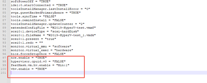 nce.enable = "TRUE" hypervisor.cpuid.v0 = "FALSE" featMask.vm.hv.enable = "Min:1" vhv.enable = "TRUE" 重启虚拟机,就可以安装HyperV 了。 ######物理机重启进bios开启 Virtual Technology 再次运行:
